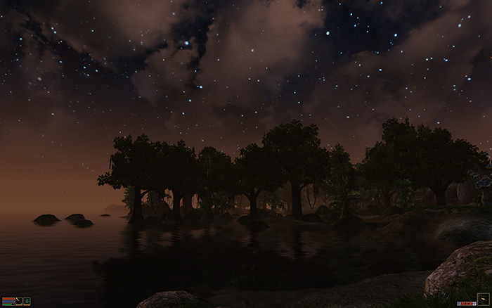 天空盒是一个包含了整个场景的(大)立方体,它包含周围环境的6个图像,让玩家以为他处在一个比实际大得多的环境当中。游戏中使用天空盒的例子有群山、白云或星空。下面这张截图中展示的是星空的天空盒,它来自于『上古卷轴3』: