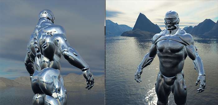 当反射应用到一整个物体上(像是箱子)时,这个物体看起来就像是钢或者铬这样的高反射性材质。如果我们加载模型加载小节中的纳米装模型,我们会得到一种整个套装都是使用铬做成的效果: