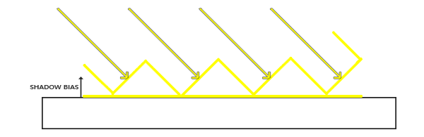 我们可以看到地板四边形渲染出很大一块交替黑线。这种阴影贴图的不真实感叫做阴影失真(Shadow Acne),下图解释了成因: