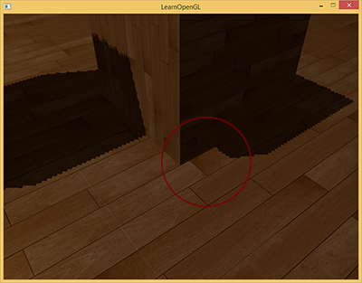 这十分有效地解决了peter panning的问题,但只对内部不会对外开口的实体物体有效。我们的场景中,在立方体上工作的很好,但在地板上无效,因为正面剔除完全移除了地板。地面是一个单独的平面,不会被完全剔除。如果有人打算使用这个技巧解决peter panning必须考虑到只有剔除物体的正面才有意义。