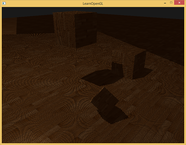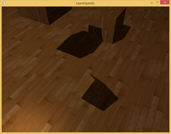 阴影现在已经附着到场景中了,不过这仍不是我们想要的。如果你放大看阴影,阴影映射对分辨率的依赖很快变得很明显。