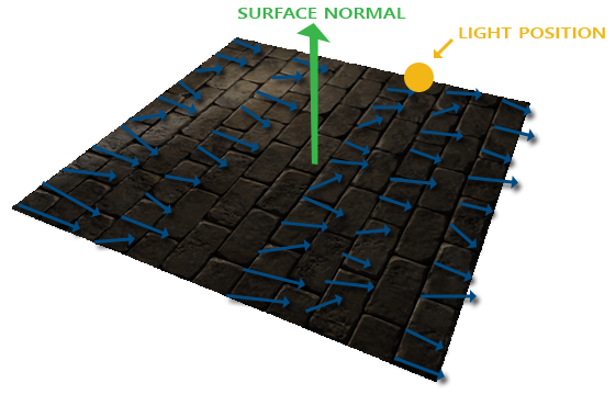 这会是一种偏蓝色调的纹理(你在网上找到的几乎所有法线贴图都是这样的)。这是因为所有法线的指向都偏向z轴(0, 0, 1)这是一种偏蓝的颜色。法线向量从z轴方向也向其他方向轻微偏移,颜色也就发生了轻微变化,这样看起来便有了一种深度。例如,你可以看到在每个砖块的顶部,颜色倾向于偏绿,这是因为砖块的顶部的法线偏向于指向正y轴方向(0, 1, 0),这样它就是绿色的了。