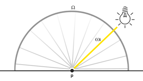 基于以上的知识,我们如何将其转化为以前的教程中积累的一些光照知识呢? 那么想象一下,我们有一个点光源(一个光源在所有方向具有相同的亮度),它的辐射通量为用RBG表示为(23.47,21.31,20.79)。该光源的辐射强度(Radiant Intensity)等于其在所有出射光线的辐射通量。 然而,当我们为一个表面上的特定的点着色时,在其半球领域的所有可能的入射方向上,只有一个入射方向向量直接来自于该点光源。 假设我们在场景中只有一个光源,位于空间中的某一个点,因而对于点的其他可能的入射光线方向上的辐射率为0: