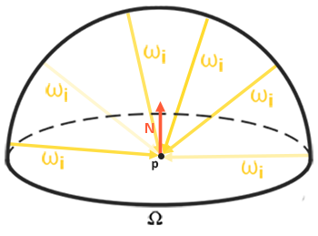 然而,计算上又不可能从 的每个可能的方向采样环境光照,理论上可能的方向数量是无限的。不过我们可以对有限数量的方向采样以近似求解,在半球内均匀间隔或随机取方向可以获得一个相当精确的辐照度近似值,从而离散地计算积分
