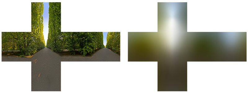 下面是一个环境立方体贴图及其生成的辐照度图的示例(由 Wave 引擎提供),每个方向 的场景辐射度取平均值。